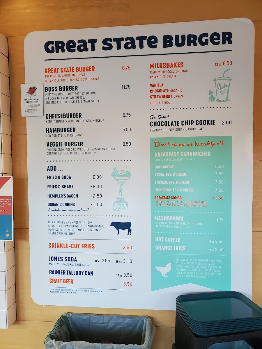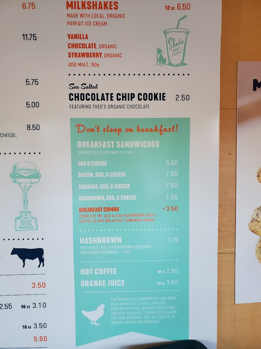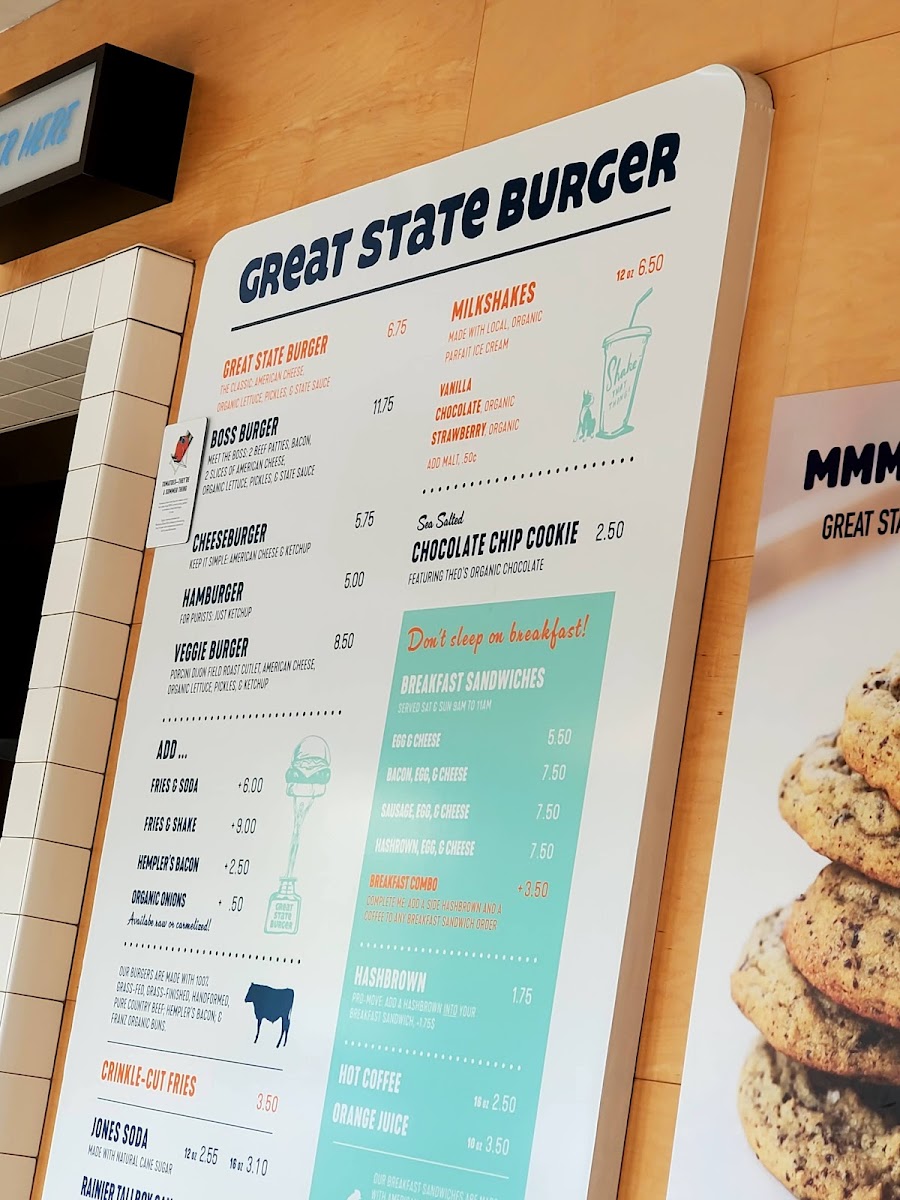 Located in the heart of Seattle, Great State Burger is a haven for burger enthusiasts. Their commitment to quality shines through in every dish. The menu starts with a delightful selection of breakfast sandwiches, featuring organic ingredients like the sausage, egg, and cheese on a buttered English muffin for just $12. Each item is crafted with care, ensuring freshness and flavor.