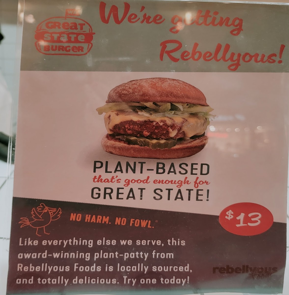 Rebellyous plant based "chicken" patty, American Cheese, State Sauce, Pickles and Organic lettuce. Make it vegan by omitting state sauce and cheese.